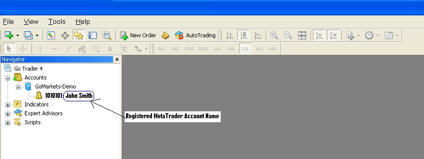 In the example below, following account number "1010101: ", "John Smith" is the registered MetaTrader Account Name...